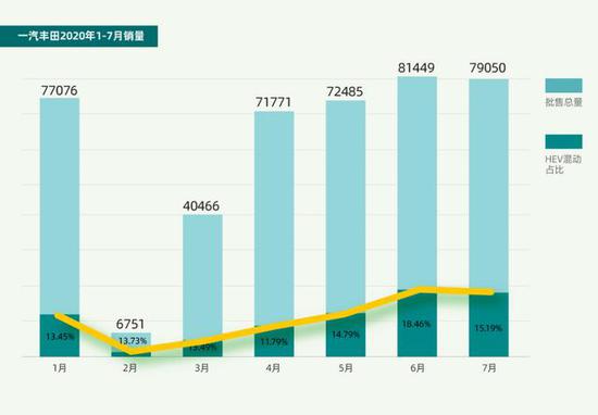 丰田作为最早在国内推行新能源产品的企业,一汽丰田从05年普锐斯的导入开创了国内油电混合动力产品先河,到目前为止,一直是国内混动技术的先行者。在某种程度上引领了国内电动化产品的趋势,坊间对于混动技术的说法:一种叫丰田,另一种叫其他,即是对其技术成熟和先进性的高度认可。因为市场的认可度越来越高,所以丰田的混动产品的近年销量占比也越来越高。7月一汽丰田总售出79050辆汽车,其中双擎混动车型占比15.19%。