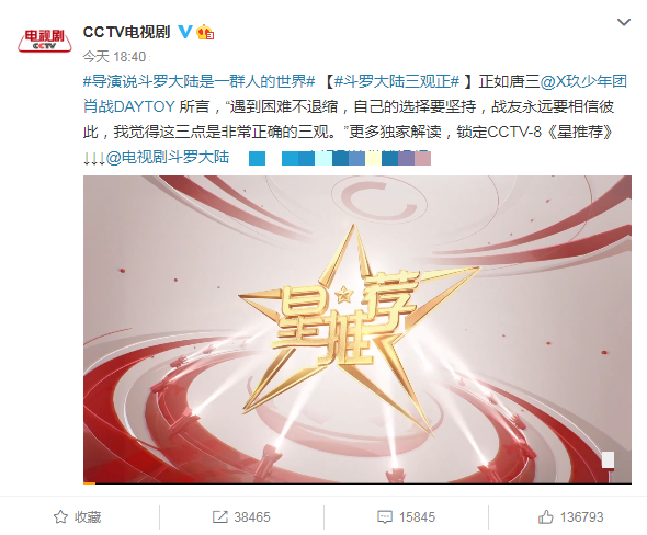 3月2日,《斗罗大陆》再次登上了8套的《星推荐》栏目。平台除了对该剧的数据大肆表扬外,对唐三这一角色的三观也给予了首肯。在肖战看来,遇事不退缩,坚持自身选择以及伙伴永远彼此信任是非常正确的三观,剧中唐三是这样做的,而肖战自己也是这样做的。